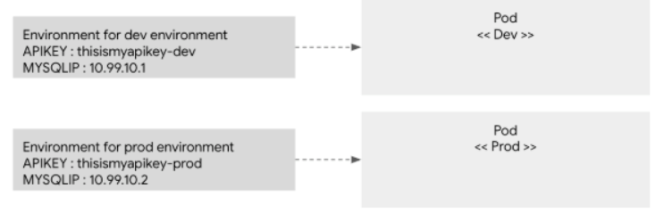 이러한 것을 극복하기 위해 환경변수나 설정값들을 변수로 관리하여 pod가 생성될때 이 값을 넣어 줄수 있는데, 이러한 기능을 제공하는 것이 바로 configMap,Secret이다.