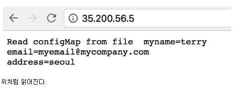 이때 중요한점은 마운트 포인트에 마운트 될때, 파일명을 configMap내의 키가 파일명이다.