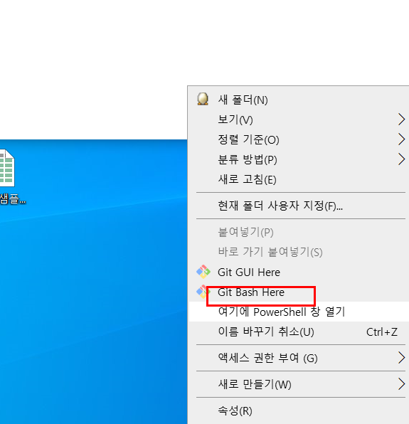 2. Shift를 누를 상태에서 마우스 오른쪽을 클릭 - git bash here