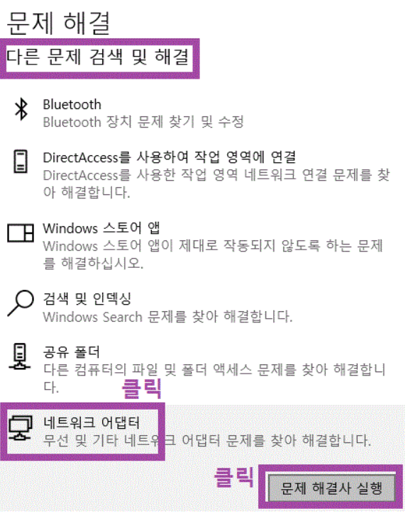 1. 윈도우 설정 -문제 해결-네트워크 어댑터 - 문제 해결사 실행