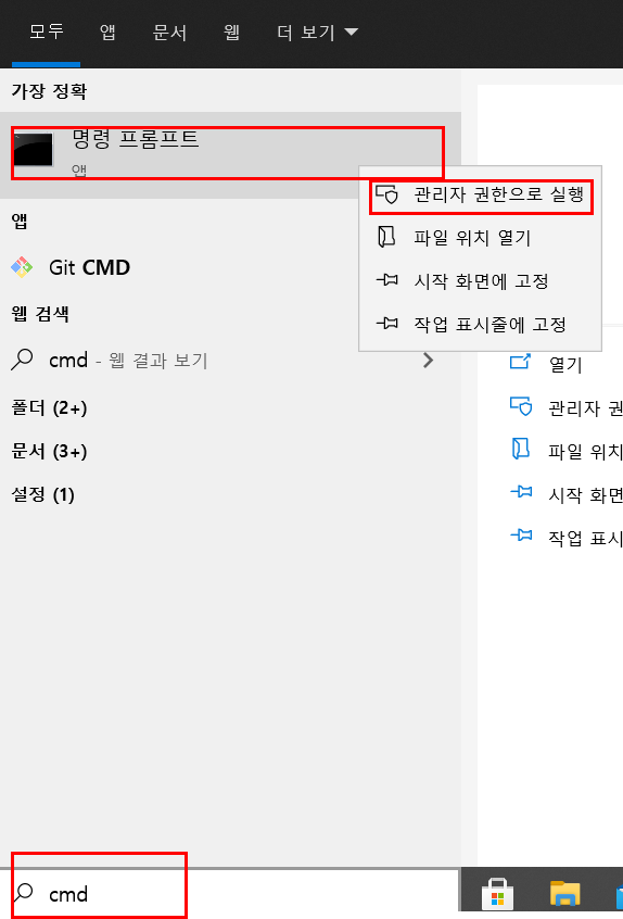 시작버튼을 누르고 cmd를 검색 후 관리자 권한으로 실행