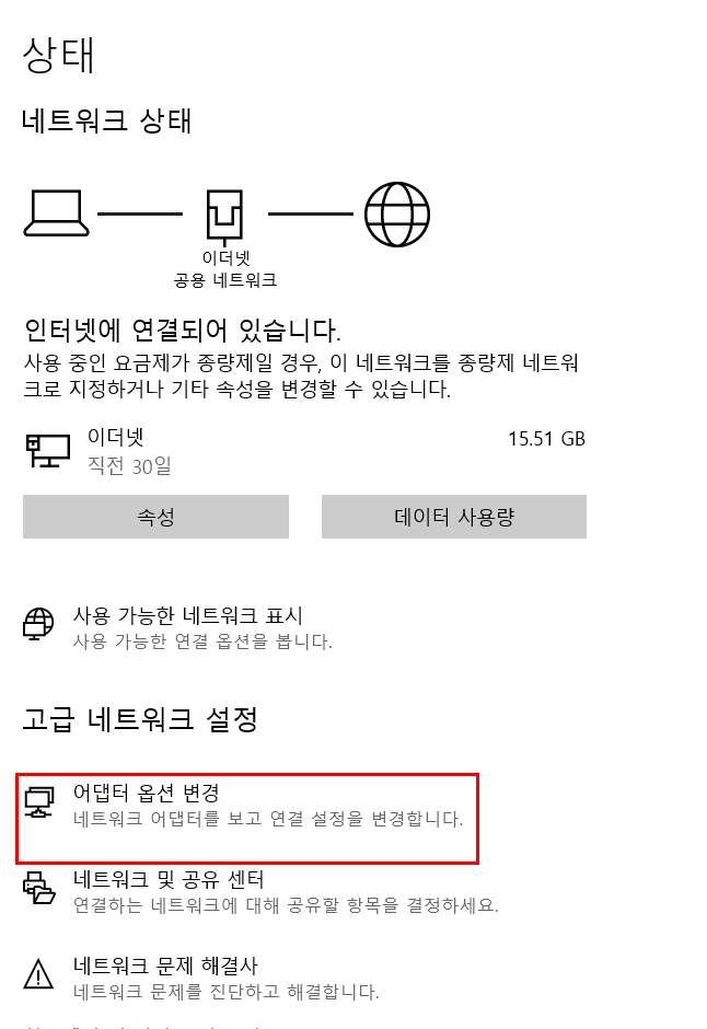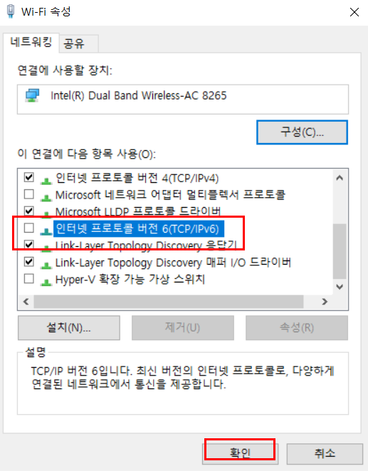 2. 어뎁터에서 Ipv6에 체크를 풀어주는 방법