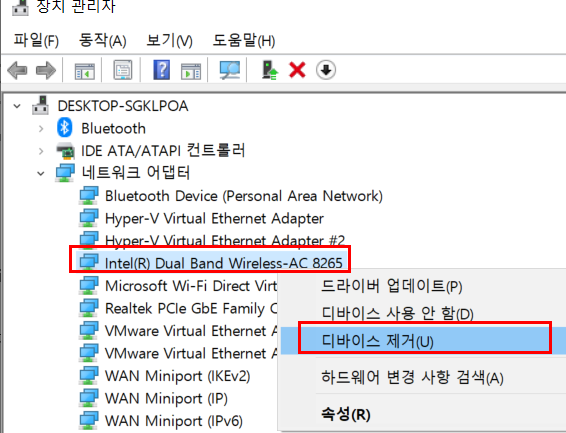 Wireless가 들어간 드라이브를 처음 업그레이드 해주고 테스트 후 안되면 삭제를 진행한다.
