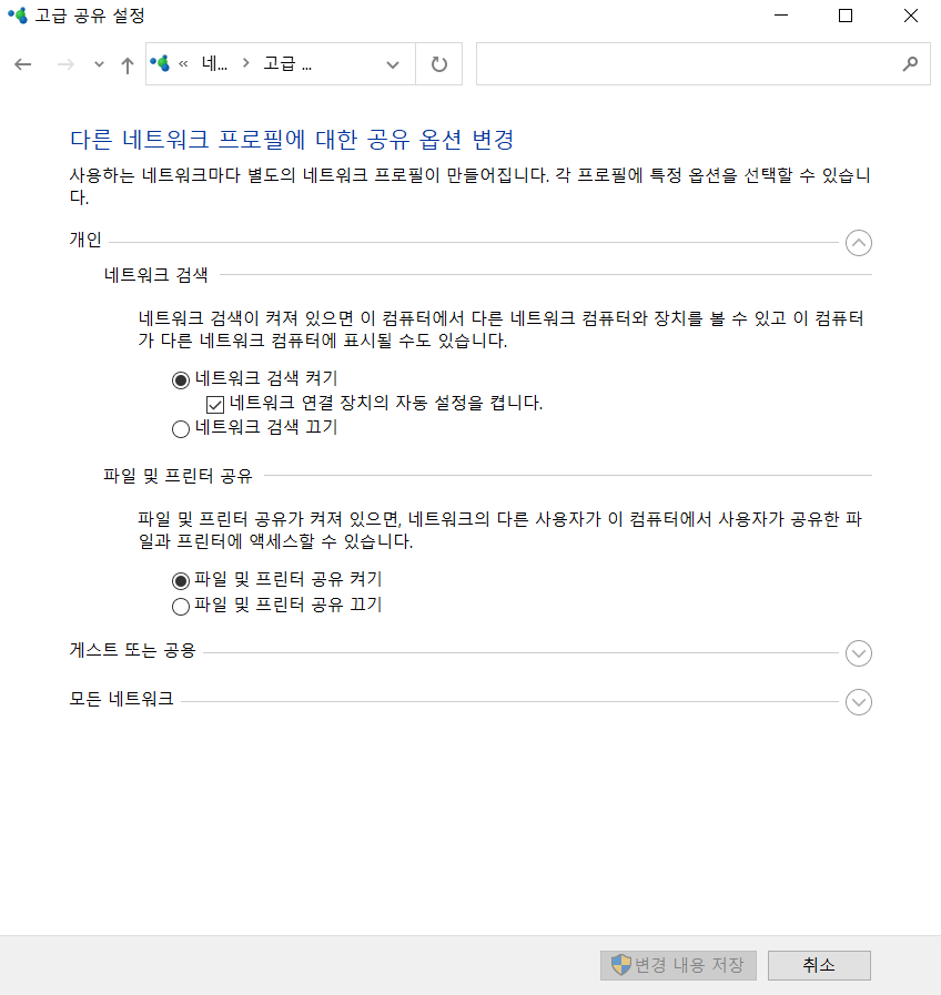 이전 단계는 네트워크 설정입니다. 2. 단계였던 공용에서 개인으로 바꿔줘야 합니다 (중요)