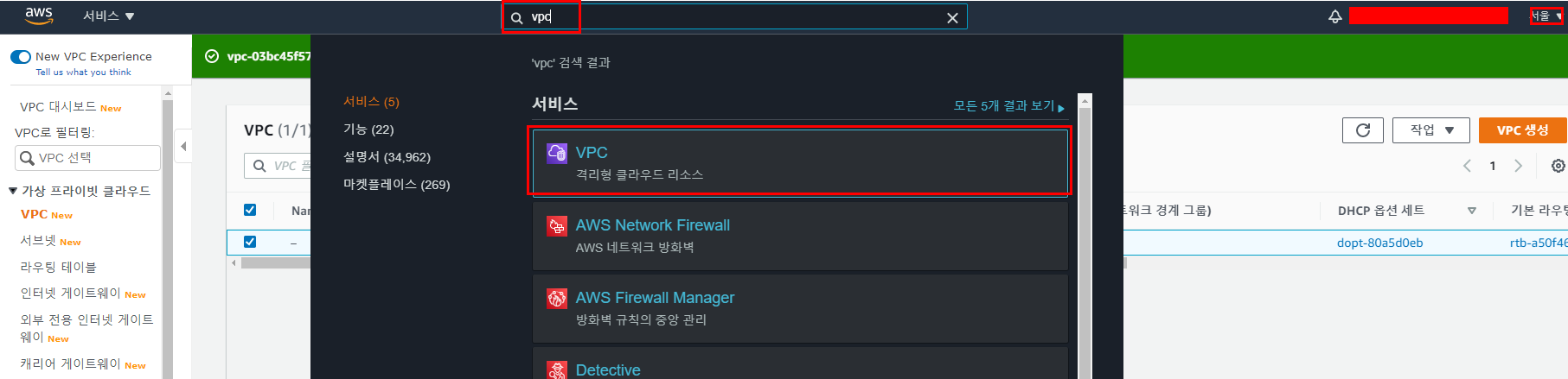 1. 서비스 화면 접속 - 가장 우측상단에 리전을 선택 원하는 나라의 aws서버에 vpc를 생성할 수 있습니다.