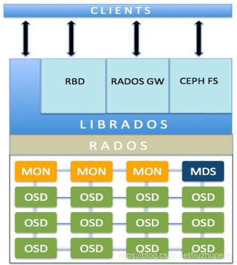 RADOS는 OSD,MON으로 기본 구성되며 사용하는 스토리지 타입에 따라 MDS, RGW를 추가적으로 사용