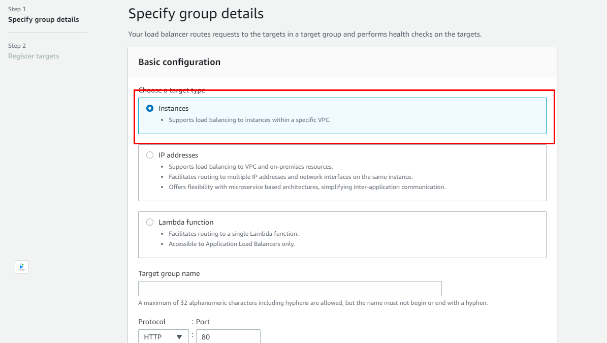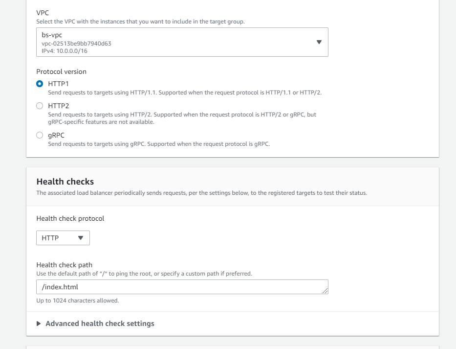 2.1. 로드벨런서 - 대상그룹- 대상그룹 생성 (인스턴스로 설정- 이름 설정 -VPC(EC2생성한 VPC)- vi로 만든 파일 이름 )