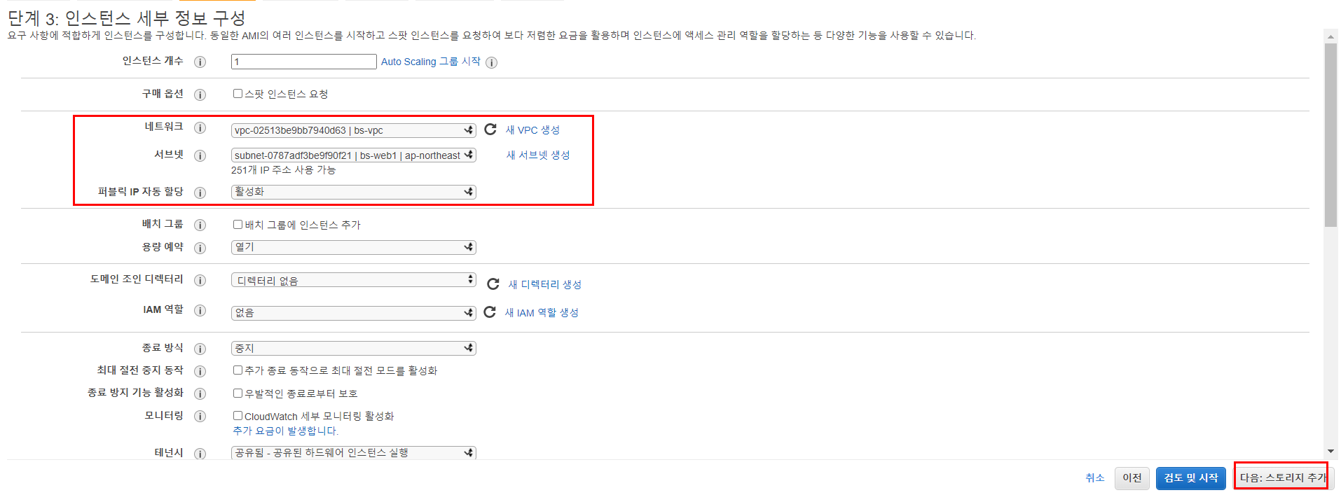 1.1. EC2 여러 설정 값 (VPC-Subnet은 퍼블릭 : 이후 생성방법 공유 ) 사진과 같이 2개 생성