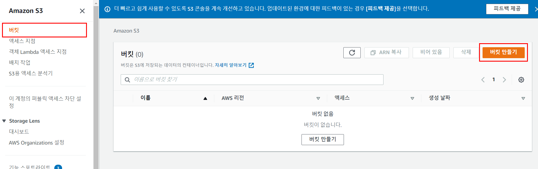 2.1. 버킷- 버킷 만들기 ( 어플리케이션을 담고 EC2 생성 시 해당 어플리케이션을 받아와서 서비스)