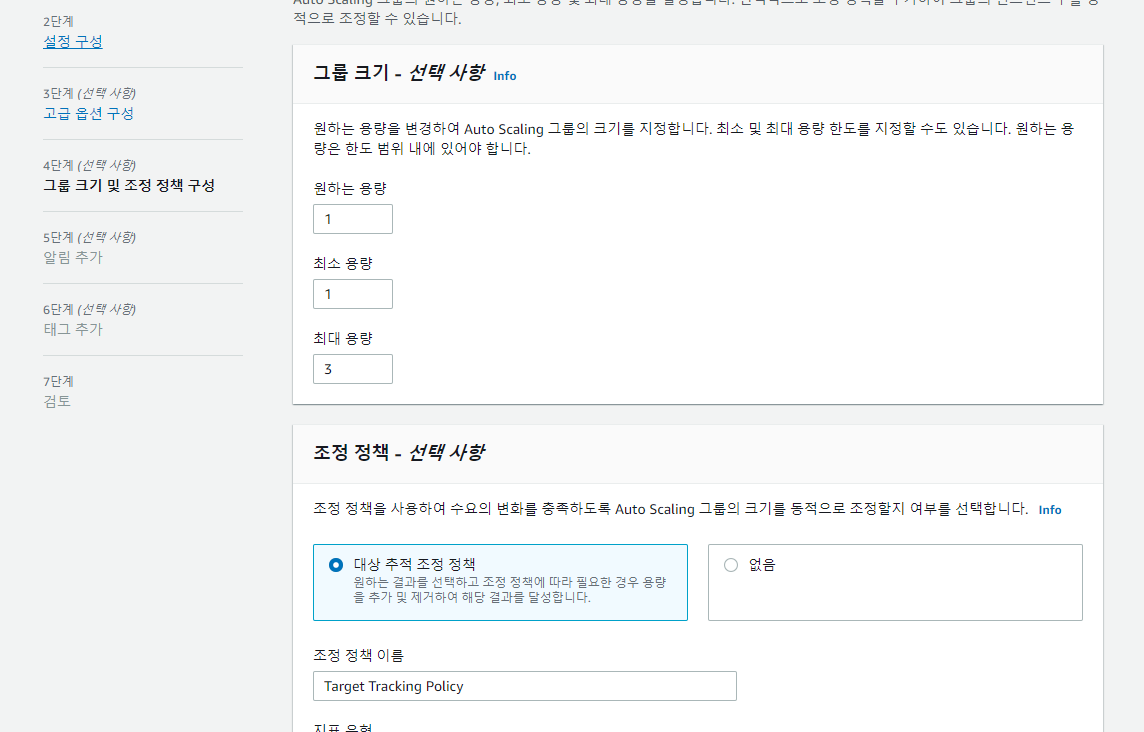 생성 시 로드벨런서와 비슷하게 오토스케일그룹을 생성해야 합니다. /추가적으로 오토스케일 룰을 줘야합니다.