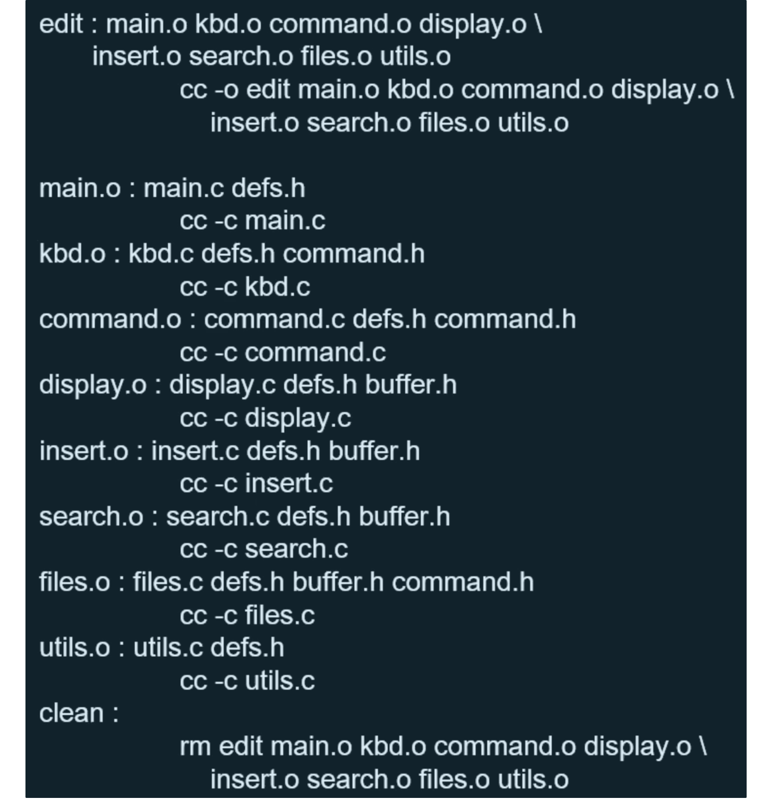 edit라는 실행파일 8개의 object파일에 의존하고, 8개의 소스파일과 3개의 헤더파일에 의존하는 방식