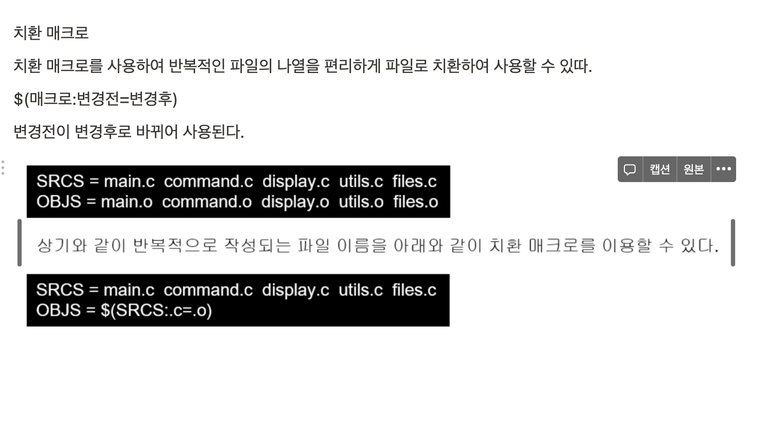 Makefile 내에 매크로를 활용하면 중복적으로 표현되는 구문을 방지하고 특정 파일이름 수정 시 모든 내용을 찾아서 수정할 필요가 없다.