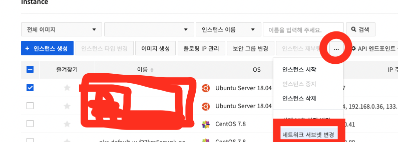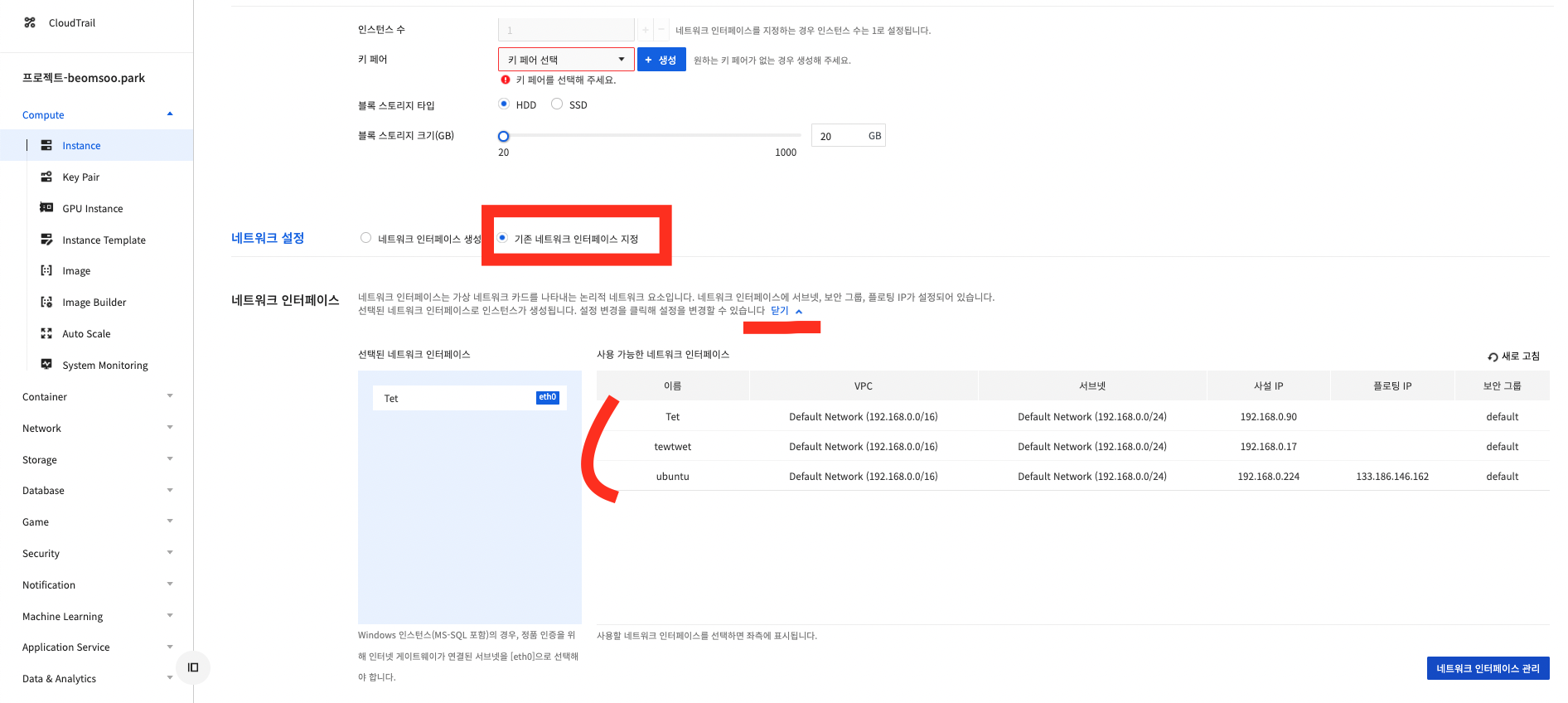 Compute > Instance > 인스턴스 생성 > 네트워크 설정 > 설정변경 > Network Interface 에서 생성한 아이피 선택