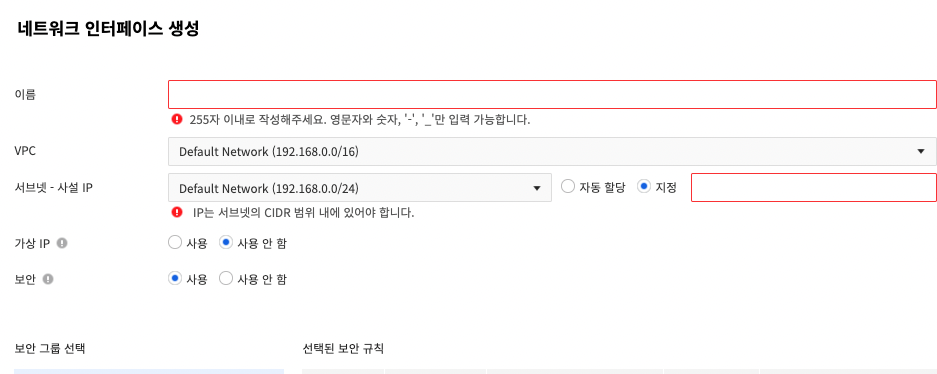 Network> Network Interface > 네트워크 인터페이스 생성 > 아이피 지정 > 생성