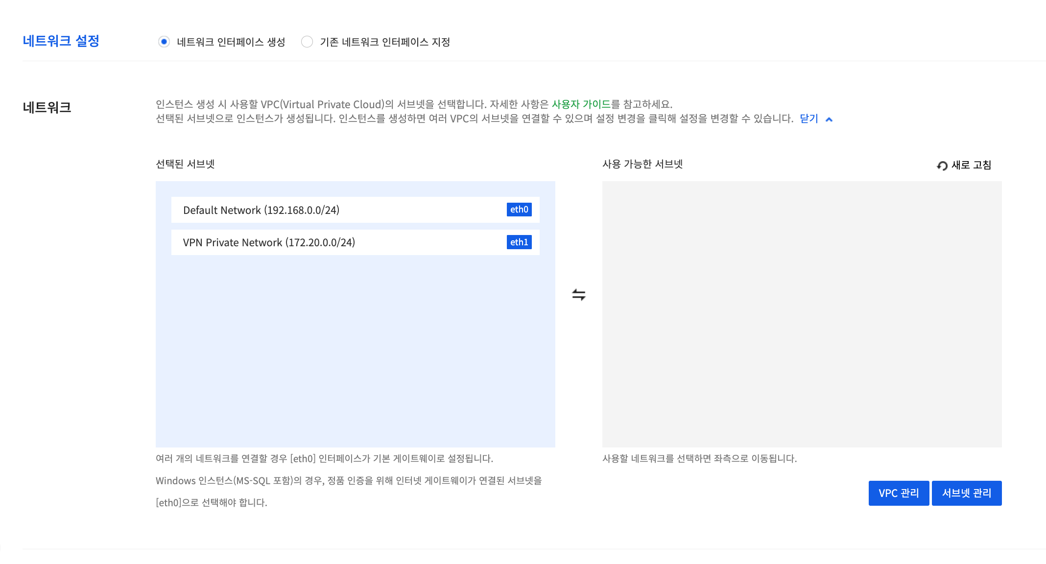 네트워크에 VPN Private Network를 eth1번에 추가를 해야한다. (* VPN Private Network는 eth0번에 두면 접속이 안되니 순서 확인)