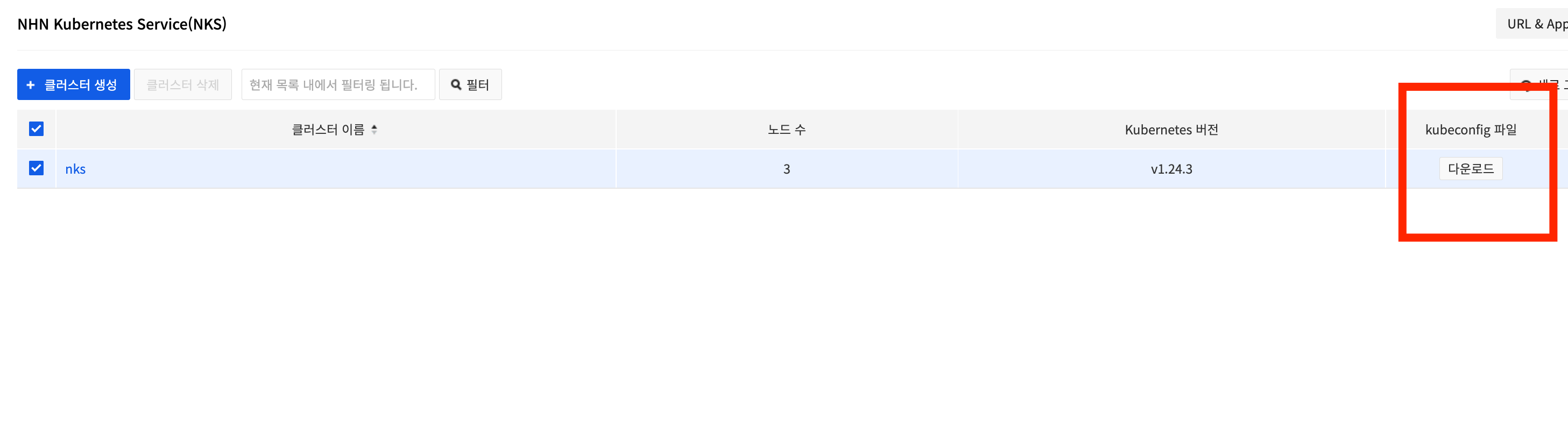 nks 가 생성 이후에 웹콘솔 kubeconfig 파일을 다운로드