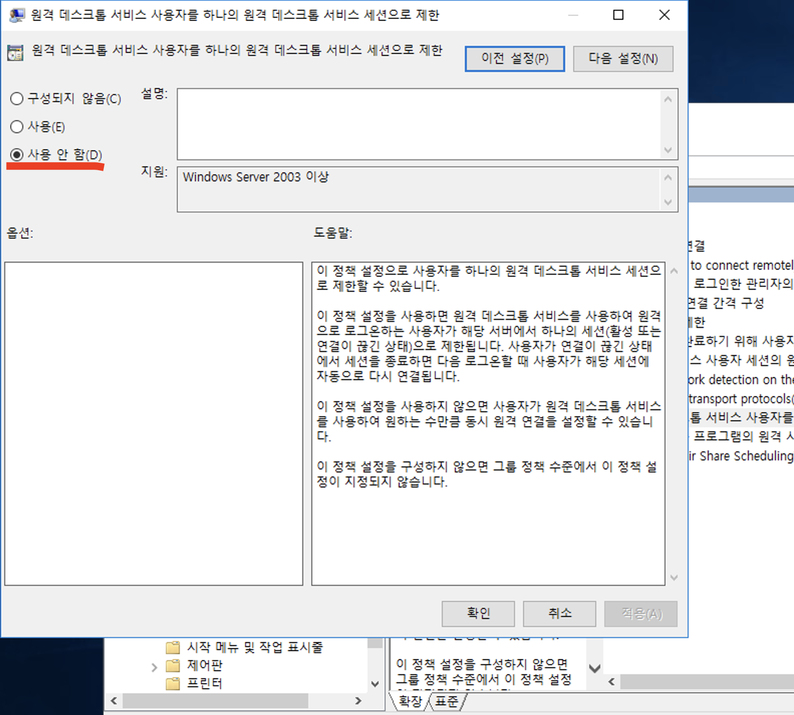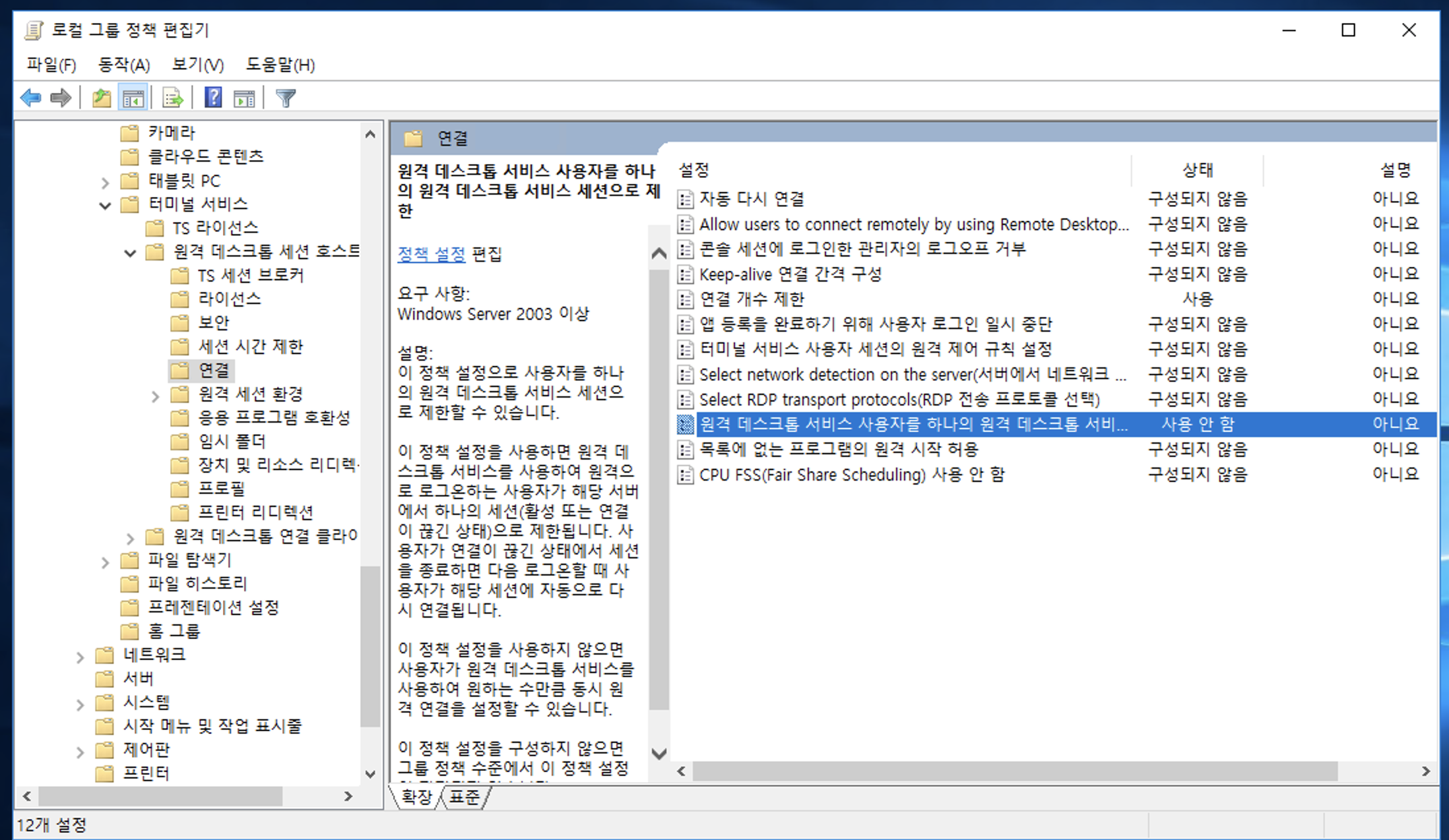 | 로컬 컴퓨터 정책] -> [컴퓨터 구성] -> [관리 템플릿] -> [Windows 구성 요소] -> [터미널 서비스] -> [원격 데스크톱 세션 호스트] - [연결] |