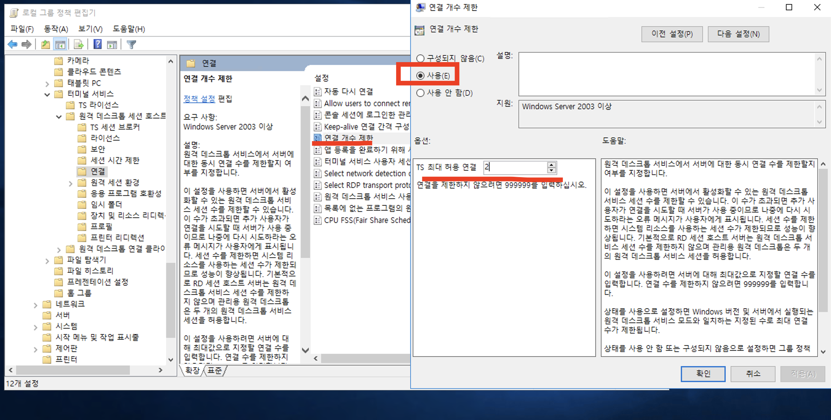 [연결 개수 제한] 항목을 열어 '사용(E)'로 변경하신 후 하단의 [TS 최대 허용 연결] 항목에 2를 입력합니다. (3개는 별도 라이센스가 필요)