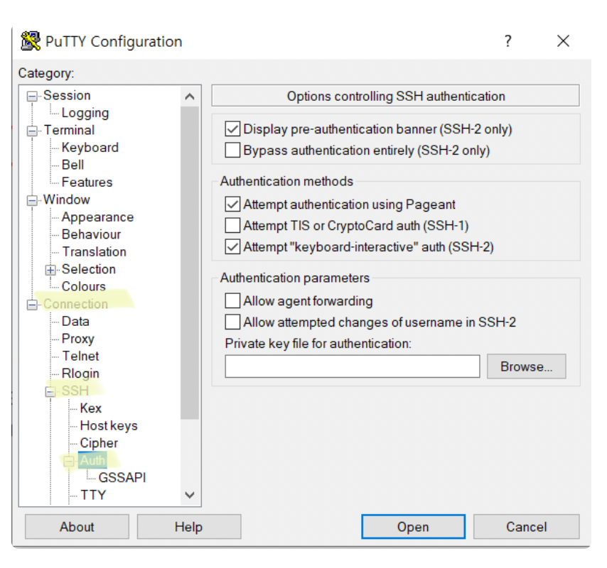 connection > ssh >auth에서 -> Brows.. 를 눌러 ppk 파일 등록