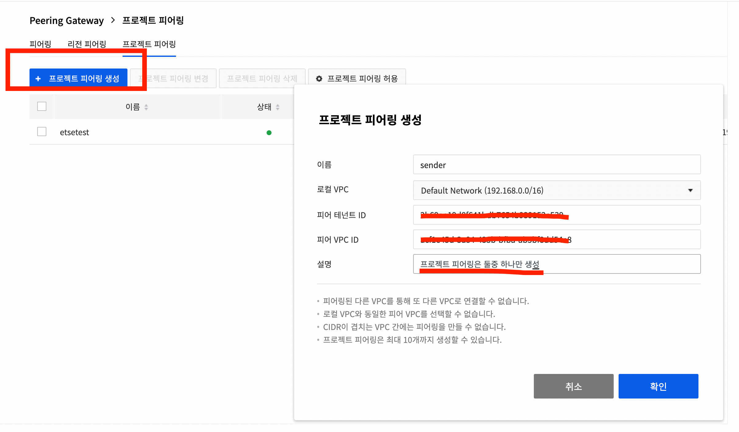 1. Network > Project Peering > 프로젝트 피어링 > 프로젝트 피어링 허용 접근하여 요청,응답 프로젝트 둘다 상대방의 정보를 기입해준다. 정보는 위 표에서 정리해 놓은 값을 넣으면 된다.