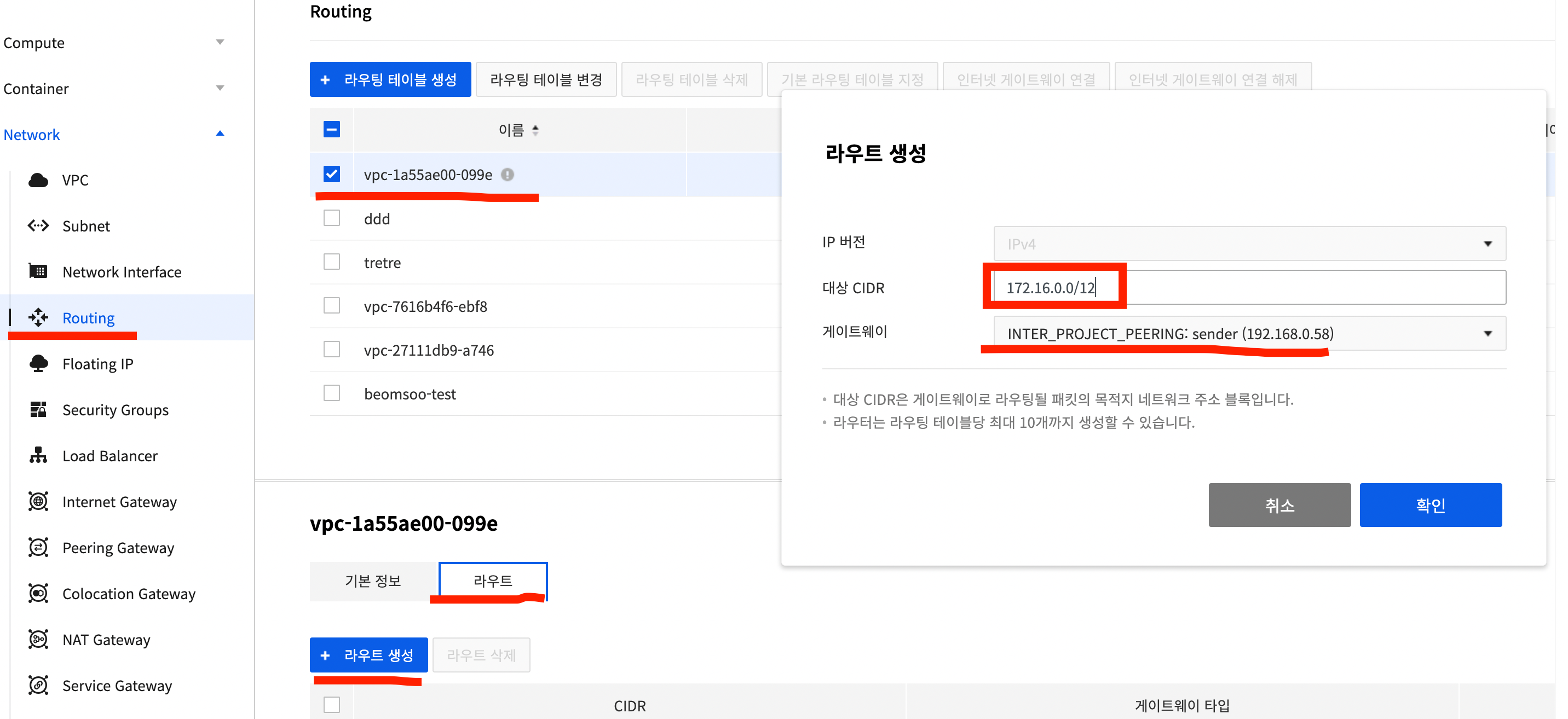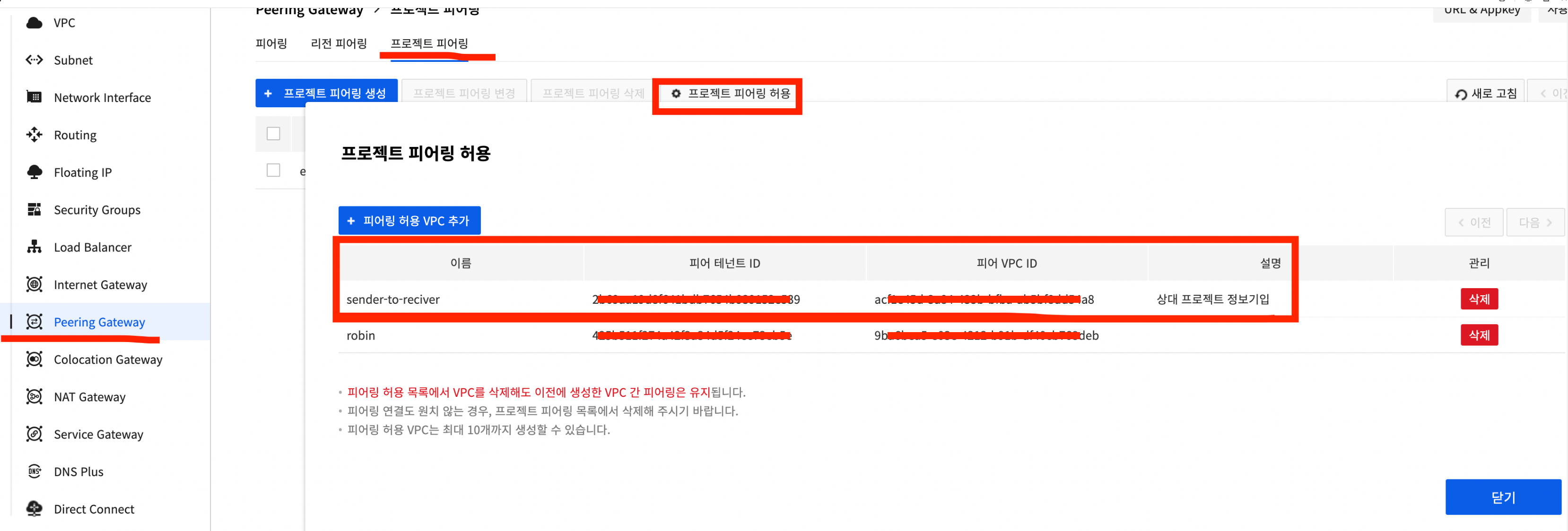 | 프로젝트 아이디 | vpc 아이디 (Network > VPC > 상세보기) | 테넌트 아이디(Network > VPC > 상세보기) | 대역 | |