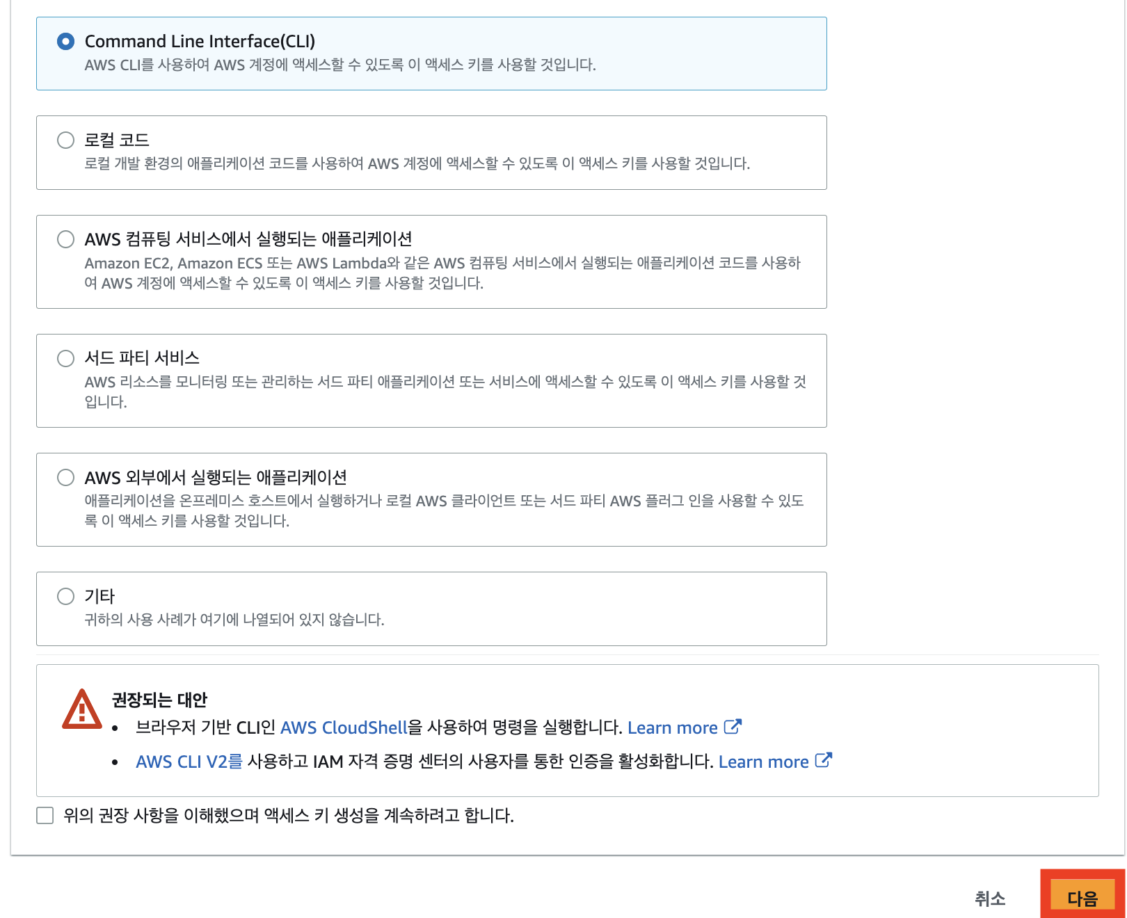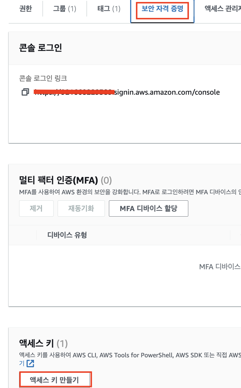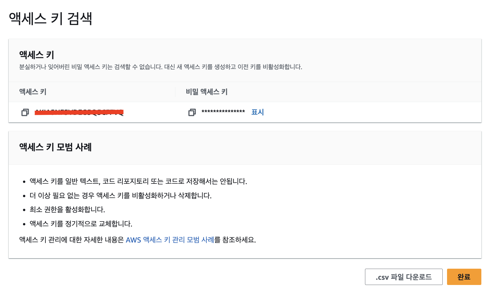 보안 자격 증명 > 엑세스 키 만들기