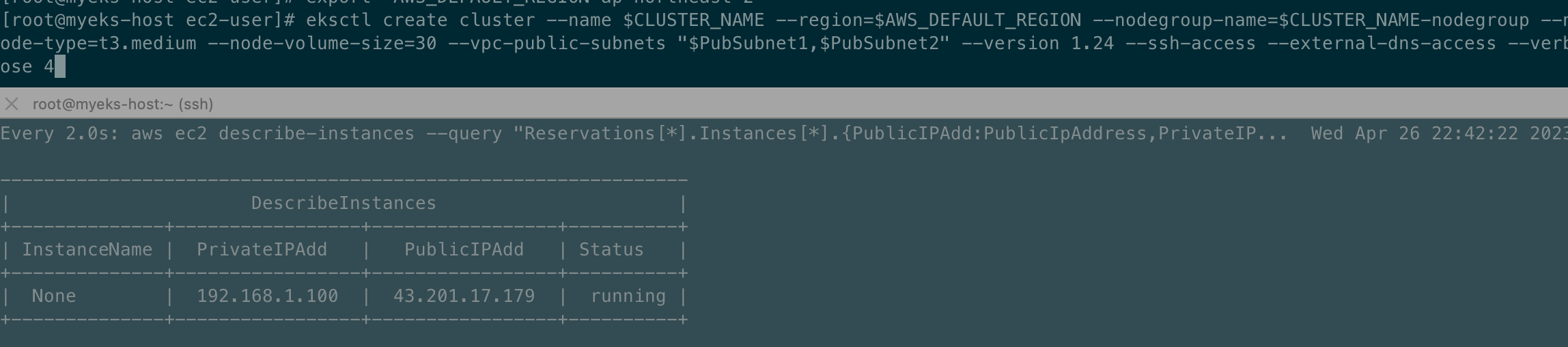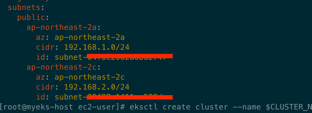 ssh -i ~/.ssh/kp-gasida.pem ec2-user@$(aws cloudformation describe-stacks --stack-name myeks --query 'Stacks[*].Outputs[0].OutputValue' --output text)
