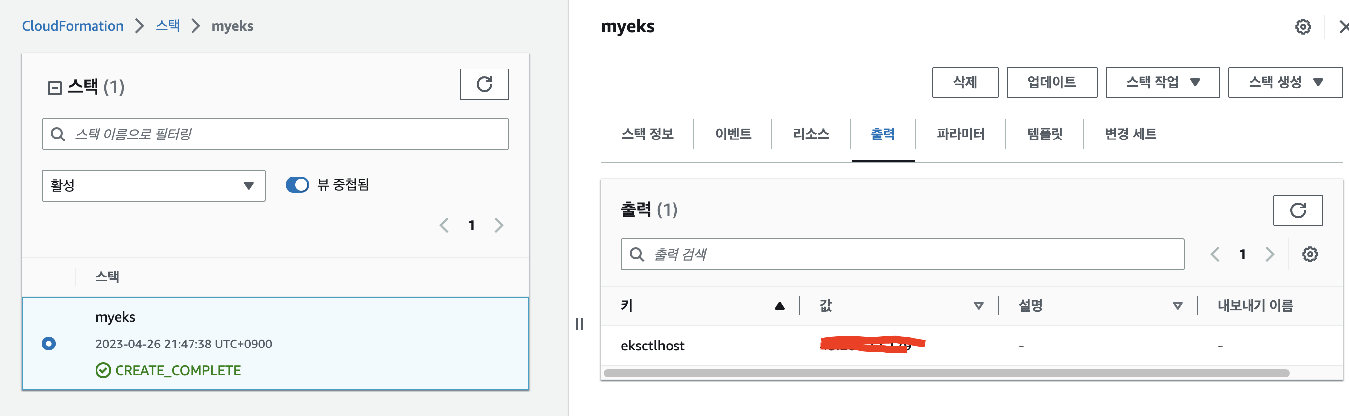웹콘솔 > CloudFomation > 스택 > myeks > 출력 > 값에 FIP
