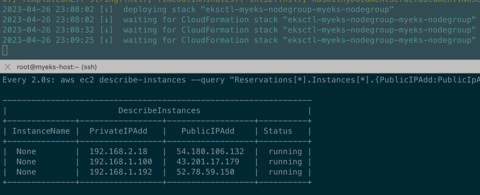 # aws cloudformation deploy --template-file ~/Downloads/myeks-1week.yaml --stack-name mykops --parameter-overrides KeyName=<My SSH Keyname> SgIngressSshCidr=<My Home Public IP Address>/32 --region <리전>
