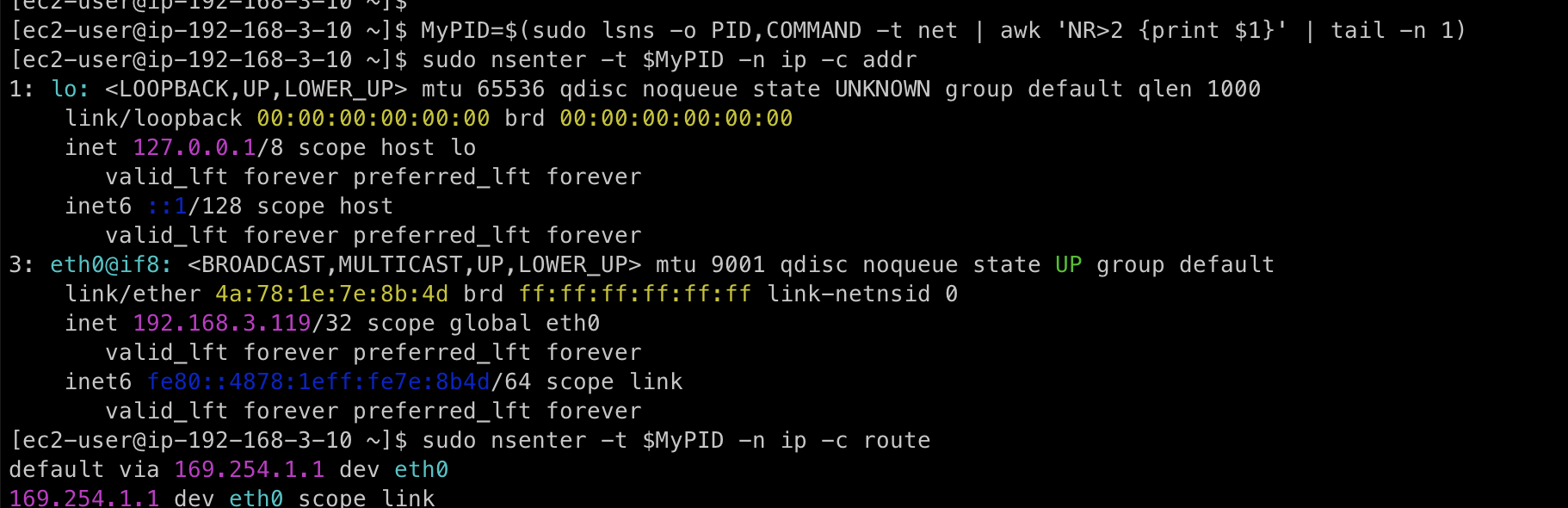 sudo nsenter -t $MyPID -n ip -c addr
