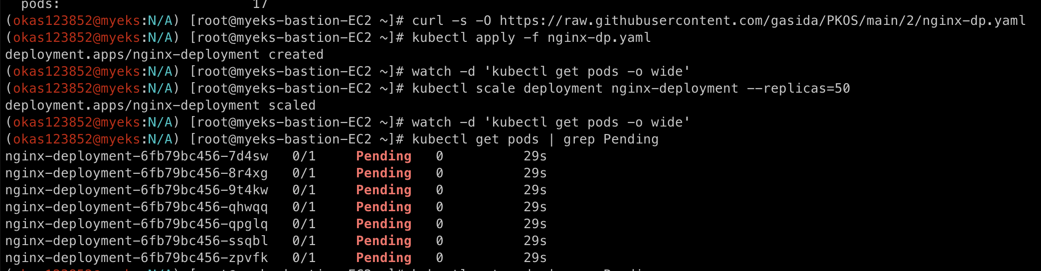 사진과 같이 최대 45개를 생성가능한 파드에서 50개를 생성하면 pending pod가 발생한다.