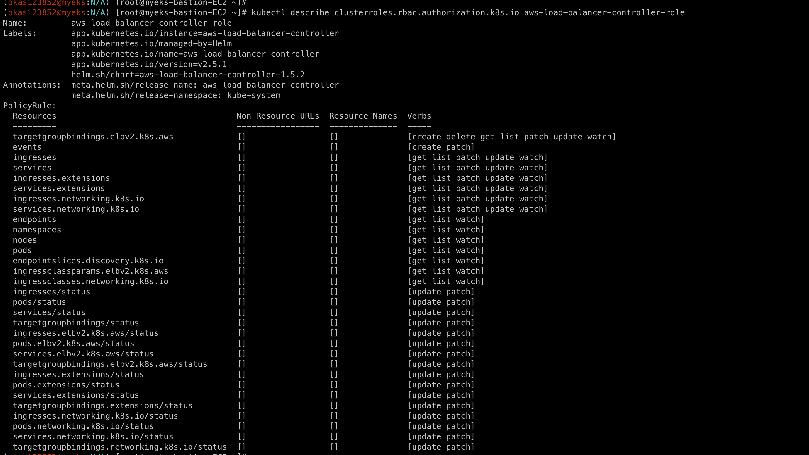 kubectl describe clusterroles.rbac.authorization.k8s.io aws-load-balancer-controller-role