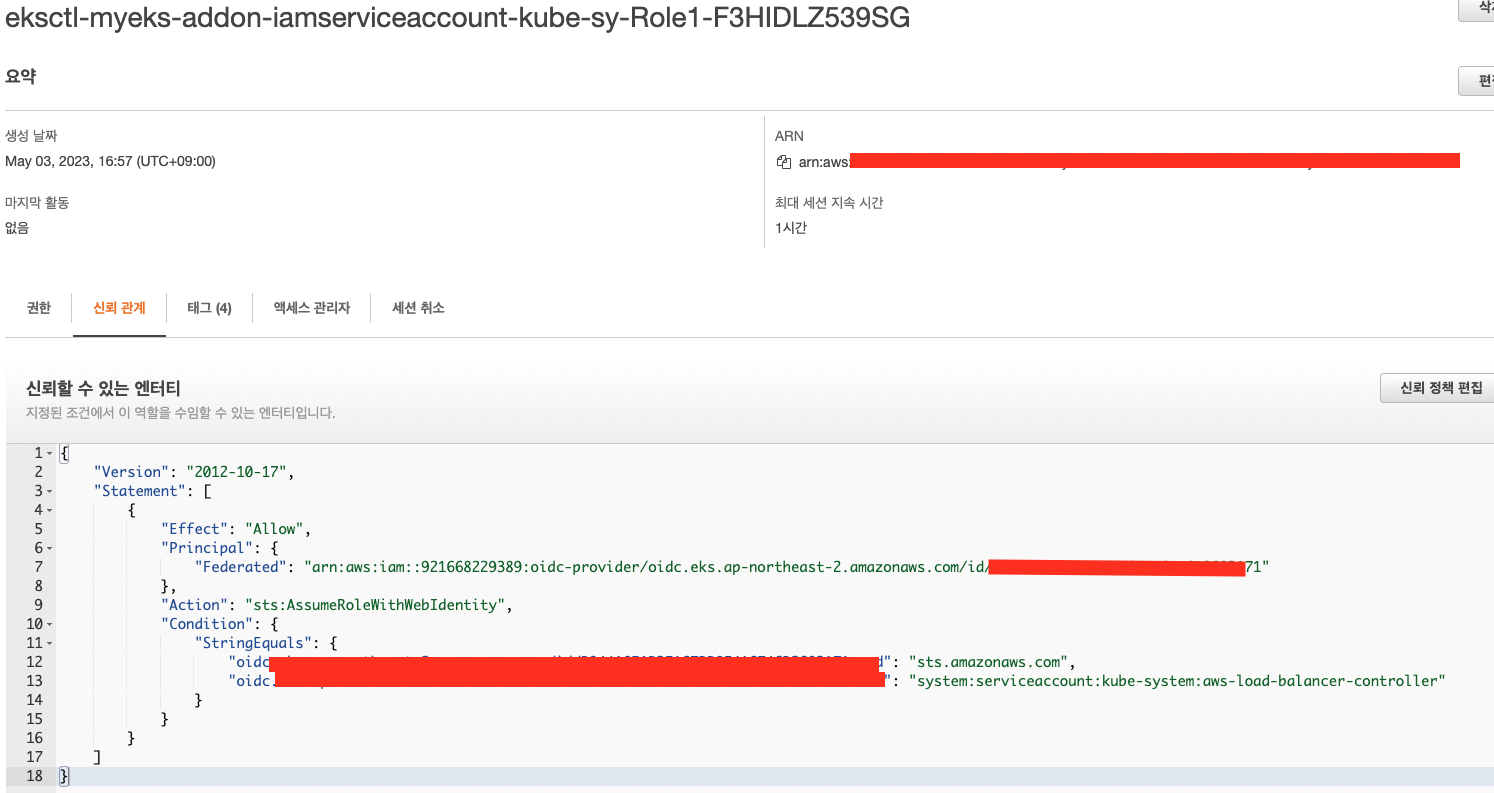 # AWS Load Balancer Controller를 위한 ServiceAccount를 생성 >> 자동으로 매칭되는 IAM Role 을 CloudFormation 으로 생성됨!