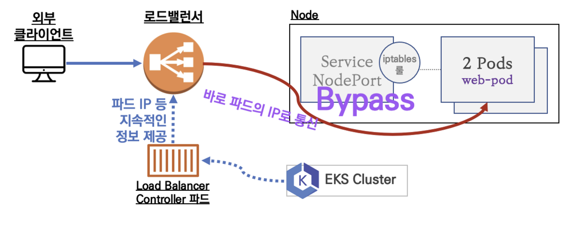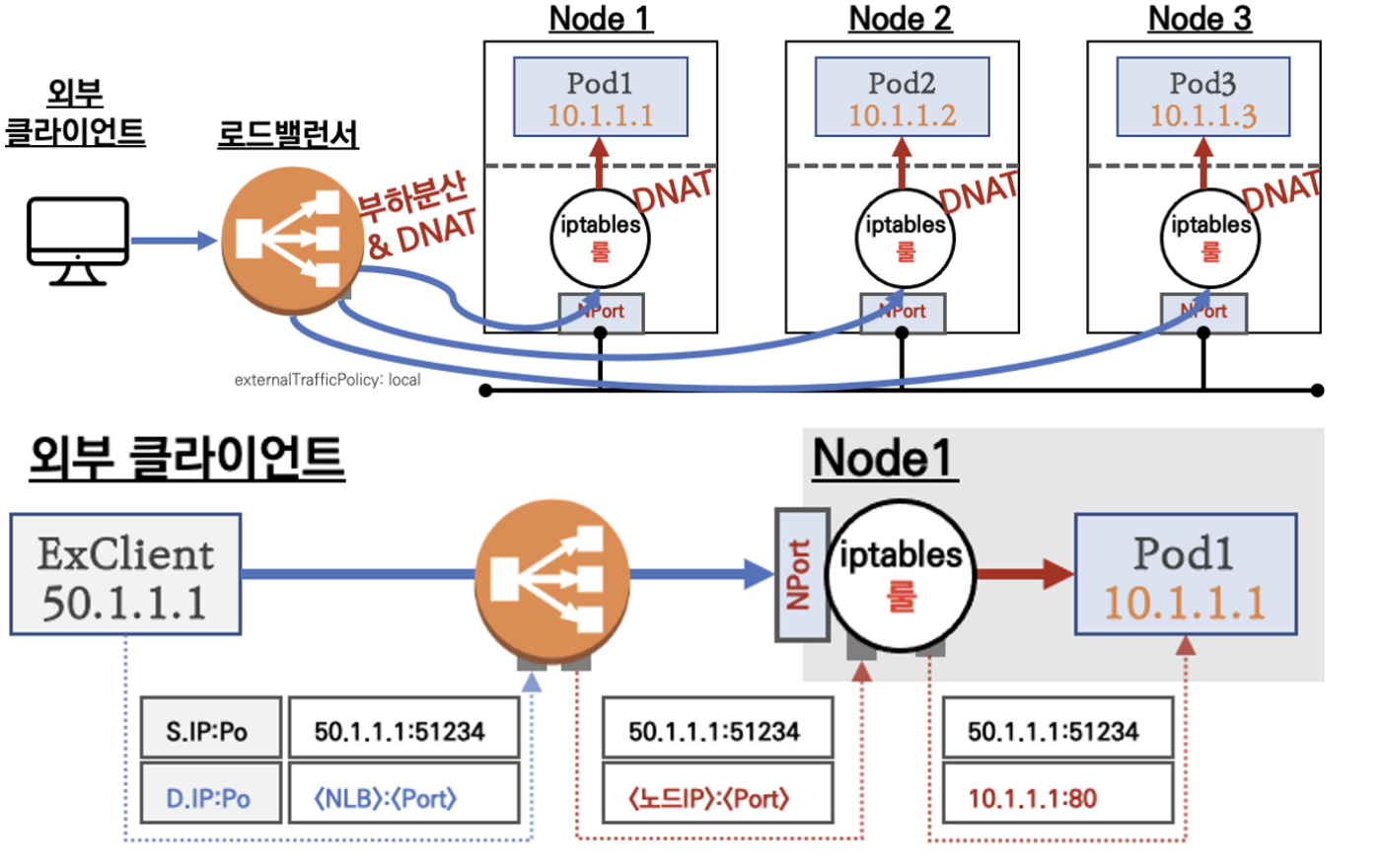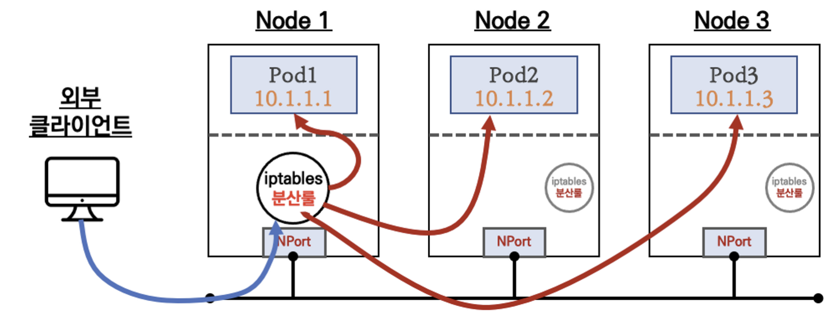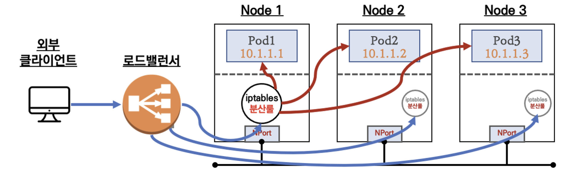 외부 클라이언트가 '로드밸런서' 접속 시 부하분산 되어 노드 도달 후 iptables 룰로 목적지 파드와 통신됨