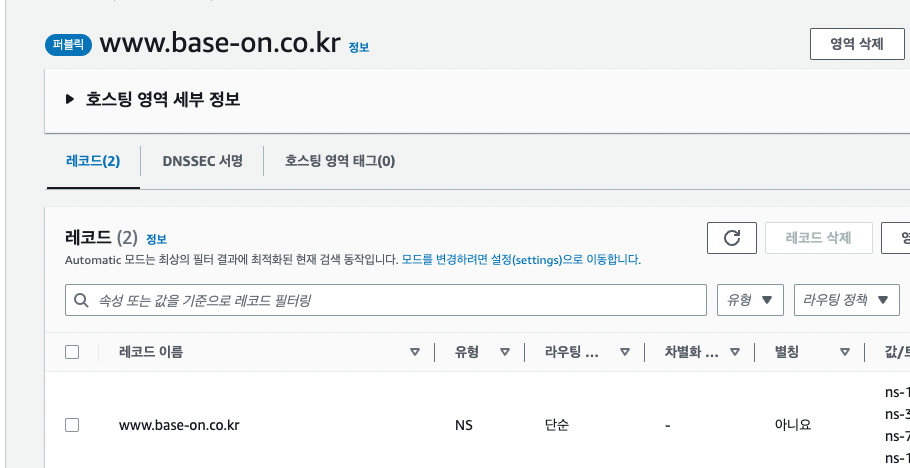 라우트53 생성하여 도메인구매처에서 도메인서버 등록 시간 소요있는 점 참고