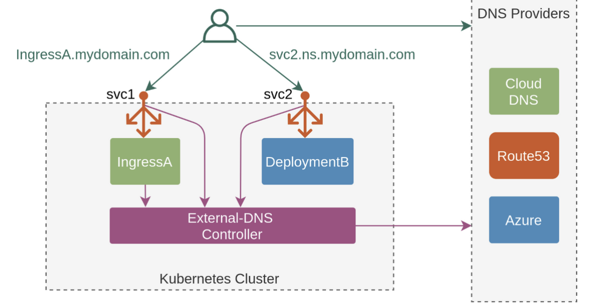 K8S 서비스/인그레스 생성 시 도메인을 설정하면, AWS(Route 53), Azure(DNS), GCP(Cloud DNS) 에 A 레코드(TXT 레코드)로 자동 생성/삭제