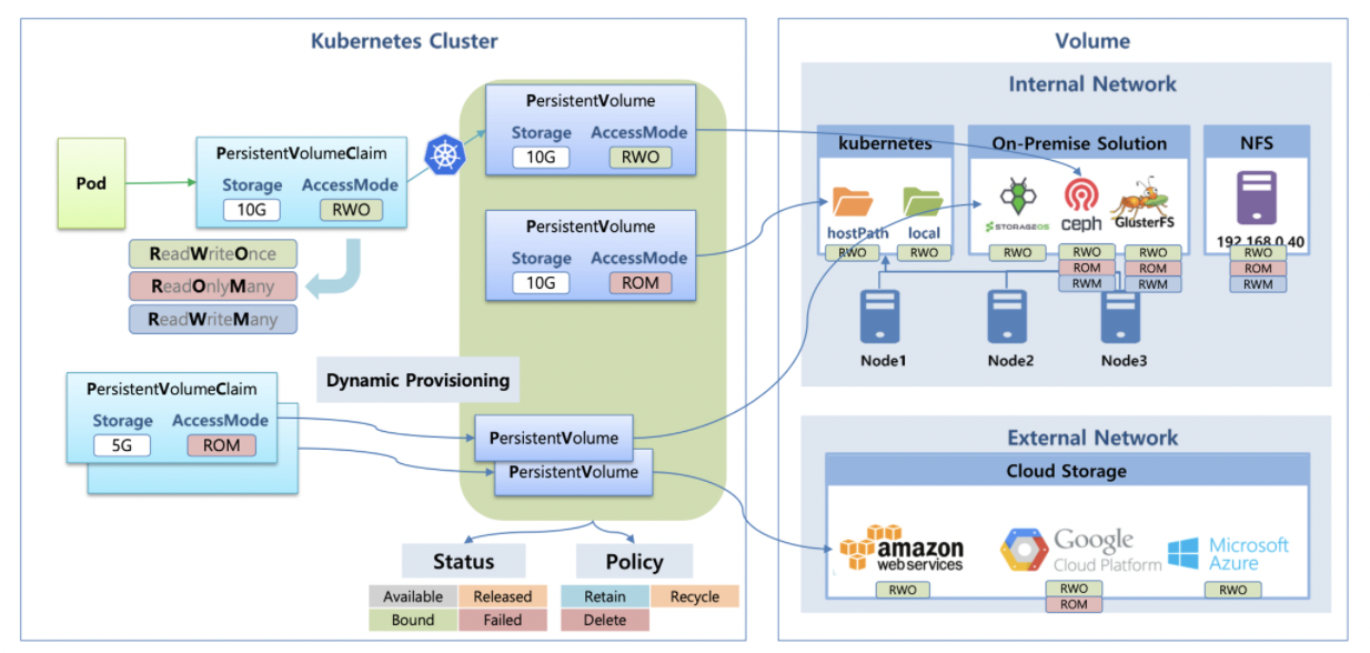 PV를 생성 시 다른 볼륨서비스를 사용하여 생성한다. 기본들은 Node의 저장공간을 확용했지만 다양한 서비스들은 Volum Service를 활용하여 Pod가 다른 노드에 생성되더라도 문제없이 생성될 것이다.