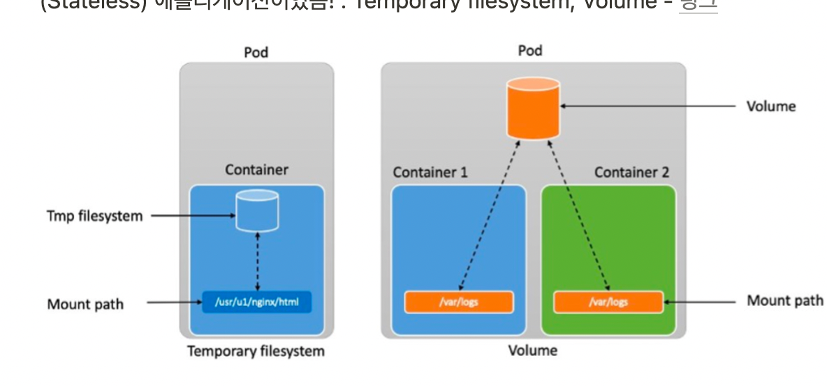 Kubernetes의 컨테이너의 기본 스토리지는 파트가 정지되면 안의 데이터도 사라져 컨테이너의 생명주기와 동일한 statelss입니다.