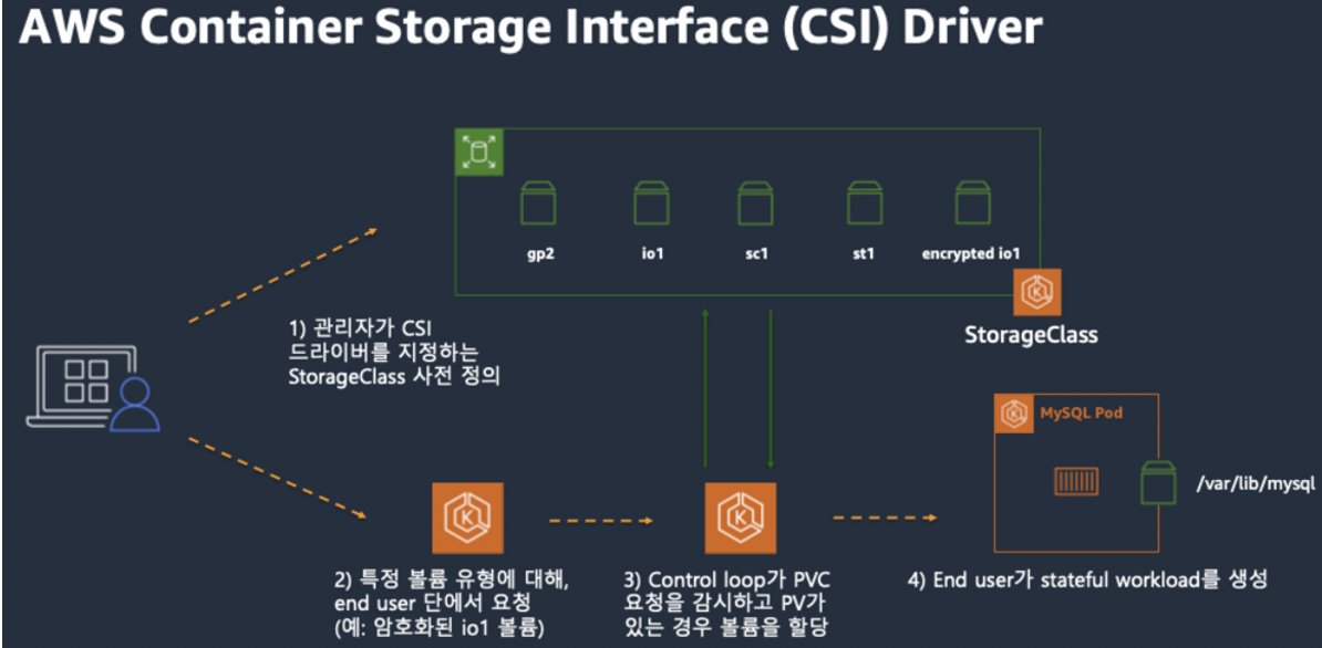 -> 스토리지를 생성하고 EKS에 연결하고 Pod에 연결하는 일련의 과정이 복잡하지만 CSI가 사용자가 간편하게 사용하라고 만들어 놓은 것이라고 생각하면 됩니다.