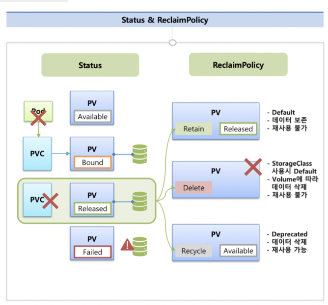 Reclaim Policy 의 정책 -> 볼륨 사용이 끝났을 때 동작