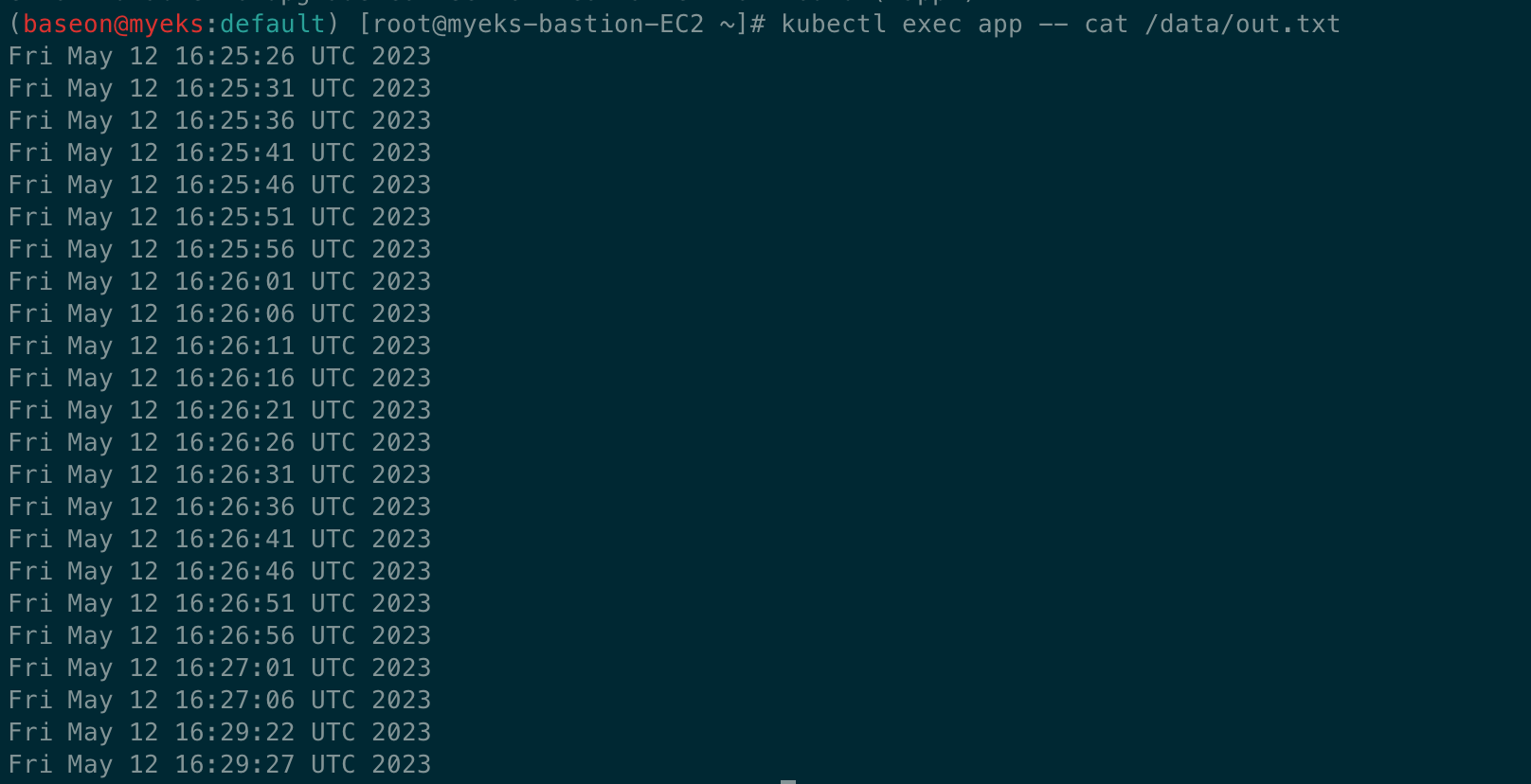 kubectl exec -it app -- head /data/out.txt