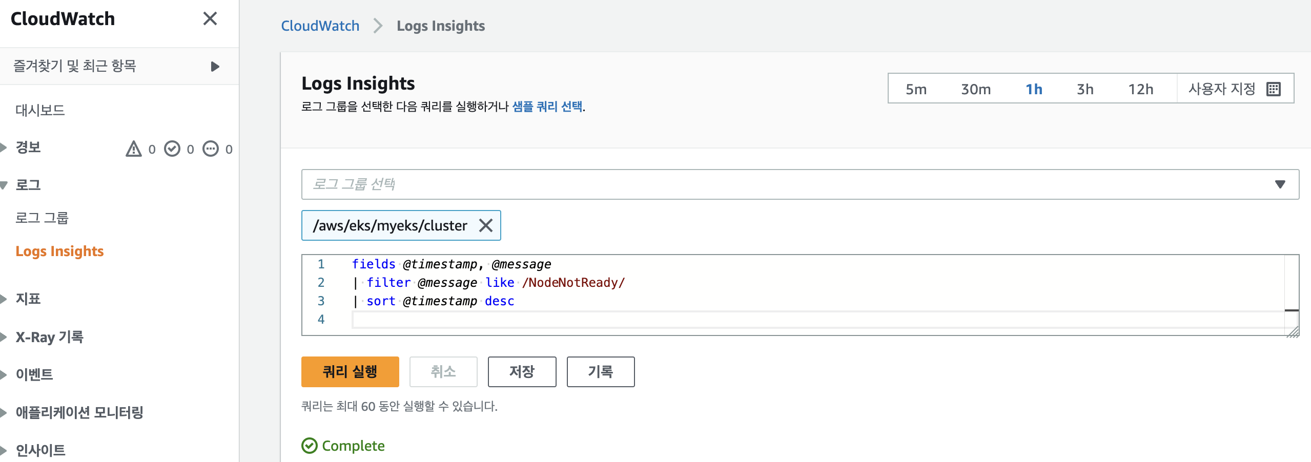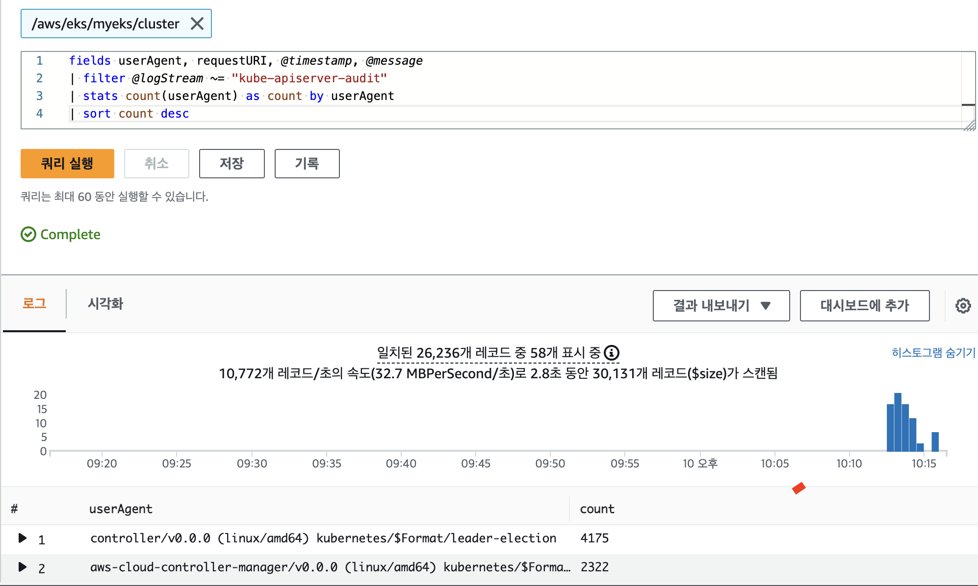 control plane metric 이 프로메테우스와 aws cloud watch logs insights 쿼리에 대해 알아보겠습니다.