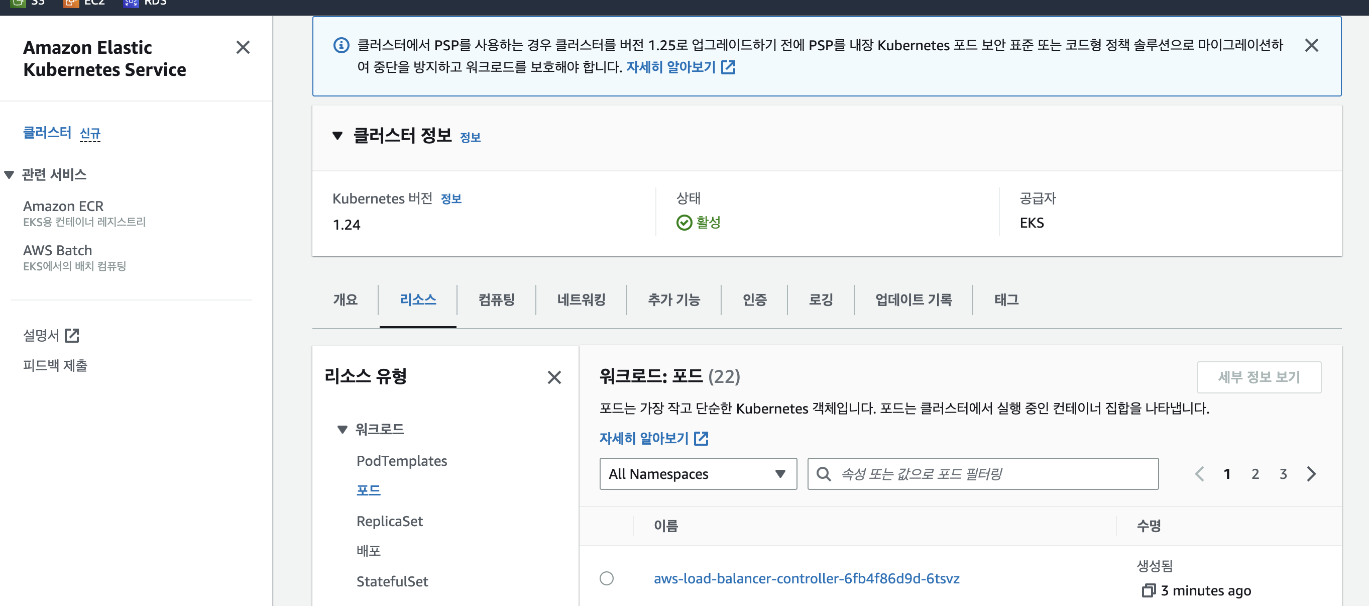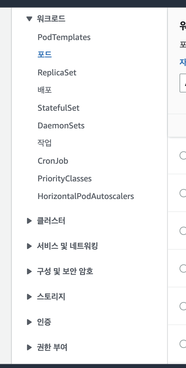 AWS 콘솔 EKS에서 여러 오브젝트를 나타나는데, K8S에 잘 알려진 리소스들의 리소스를 리스트화 해놨다.