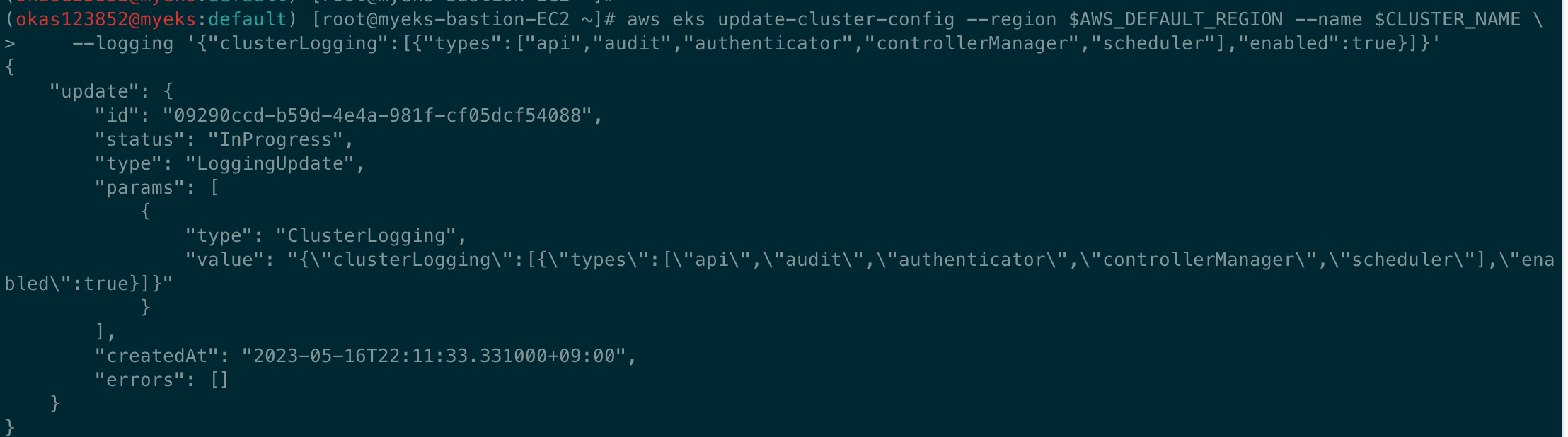 aws eks update-cluster-config --region $AWS_DEFAULT_REGION --name $CLUSTER_NAME \