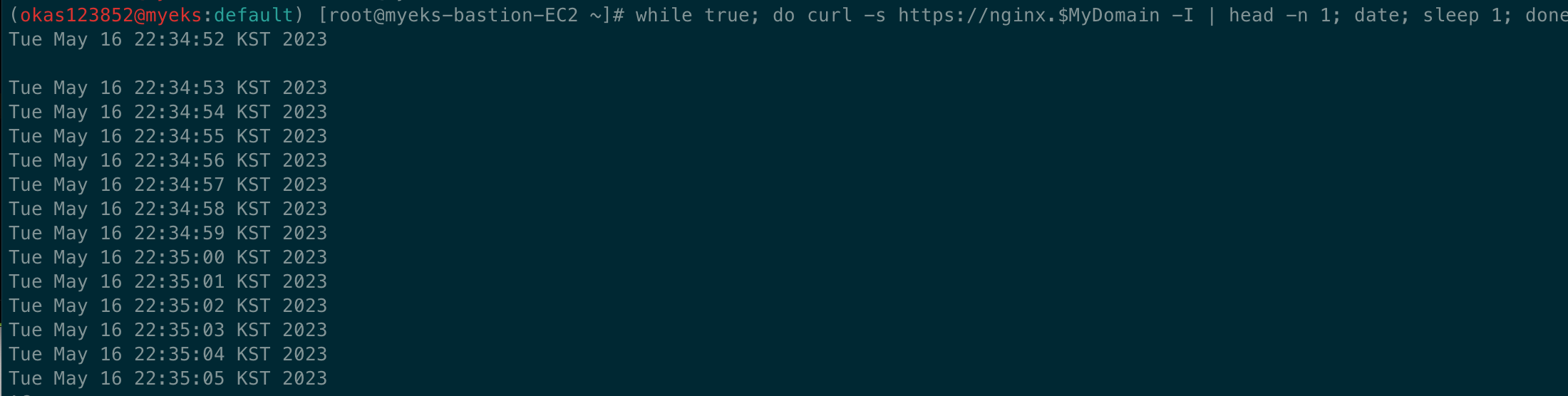 while true; do curl -s https://nginx.$MyDomain -I | head -n 1; date; sleep 1; done