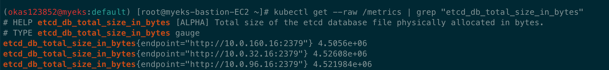kubectl get --raw /metrics | grep "etcd_db_total_size_in_bytes"