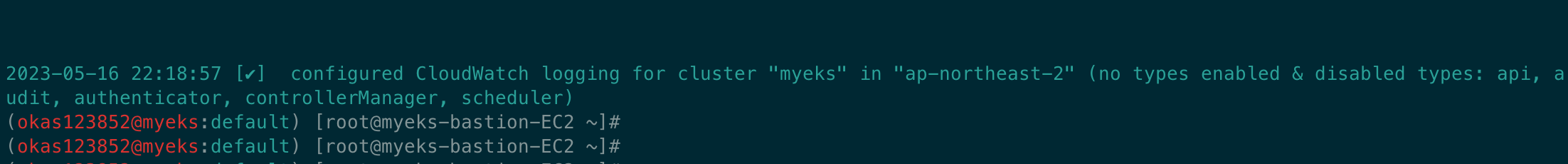 eksctl utils update-cluster-logging --cluster $CLUSTER_NAME --region $AWS_DEFAULT_REGION --disable-types all --approve