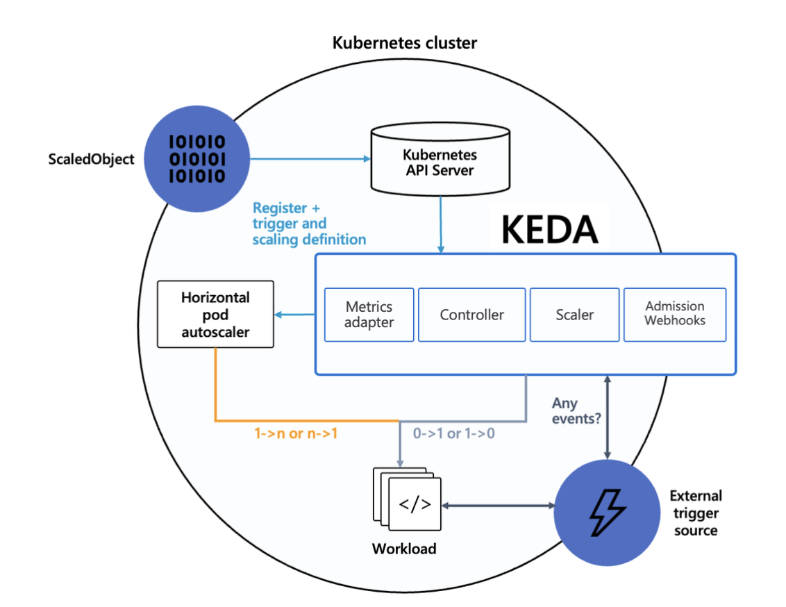 HPA와 차이점 :기존의 HPA(Horizontal Pod Autoscaler)는 리소스(CPU, Memory) 메트릭을 기반으로 스케일 여부를 결정하게 됩니다. 반면에 KEDA는 특정 이벤트를 기반으로 스케일 여부를 결정할 수 있습니다. > 더 빠르게 확장 가능