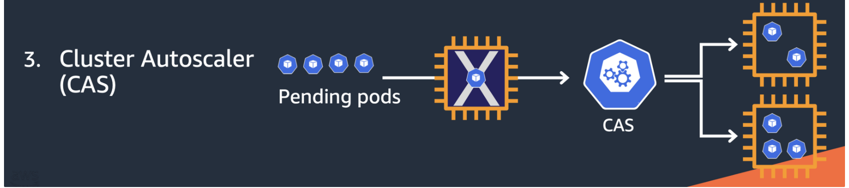 3. Cluster Autoscaling (CAS) : pending 인 pod가 있으면 워커노드를 늘려 running으로 변경하는 방법