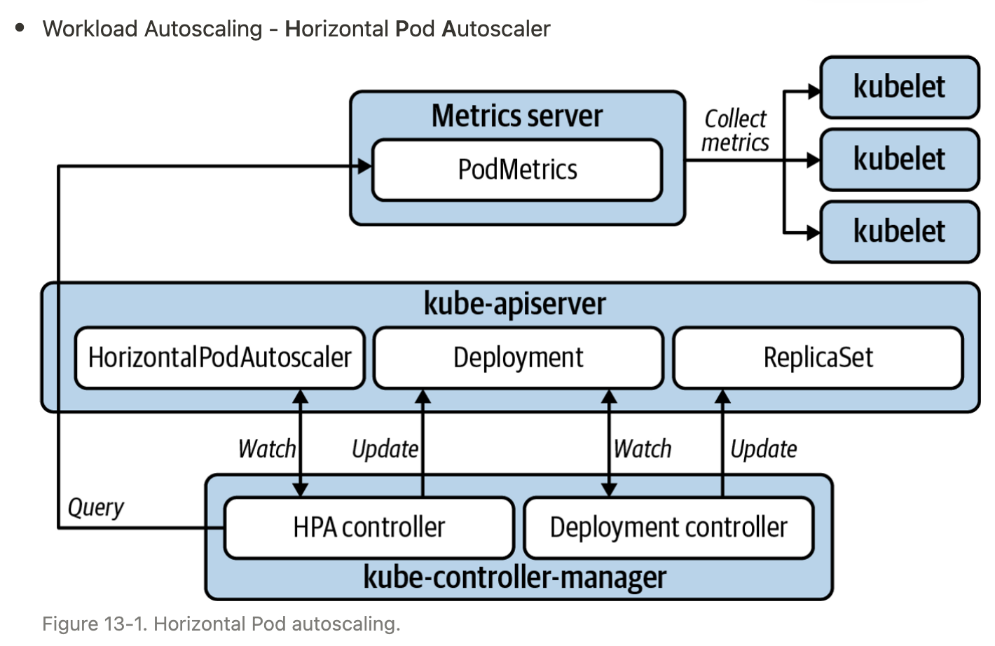 HPA 아키텍처 : cAdvisor 이 컨테이너의 메모리/CPU 수집 → metrics-server 는 kubelet 를 통해서 수집 후 apiserver 에 등록 → HPA는 apiserver(Resource API)를 통해서 15분 마다 메모리/CPU 수집하여 정책에 따라 동작